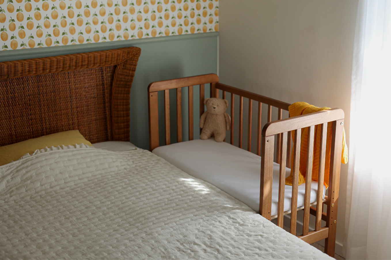 - Wooden Co‑Sleeper – remove a side to attach to your bed, or use in stand‑alone mode; optional wheels make it easy to move around the home.