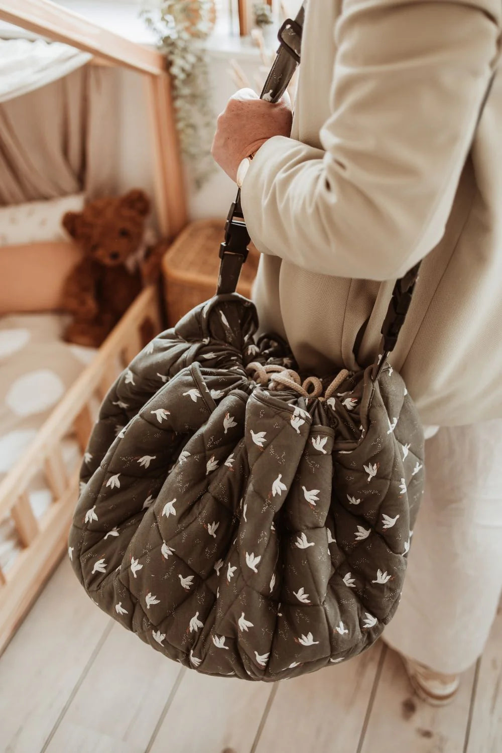 Dal tempo prono al riordino rapido, questo tappetino gioco per bambini 3-in-1 in cotone organico certificato GOTS si trasforma in una borsa per i giocattoli e una pratica borsa per pannolini, unendo comodità quotidiana a uno stile giocoso e con motivi per la nursery o in viaggio.