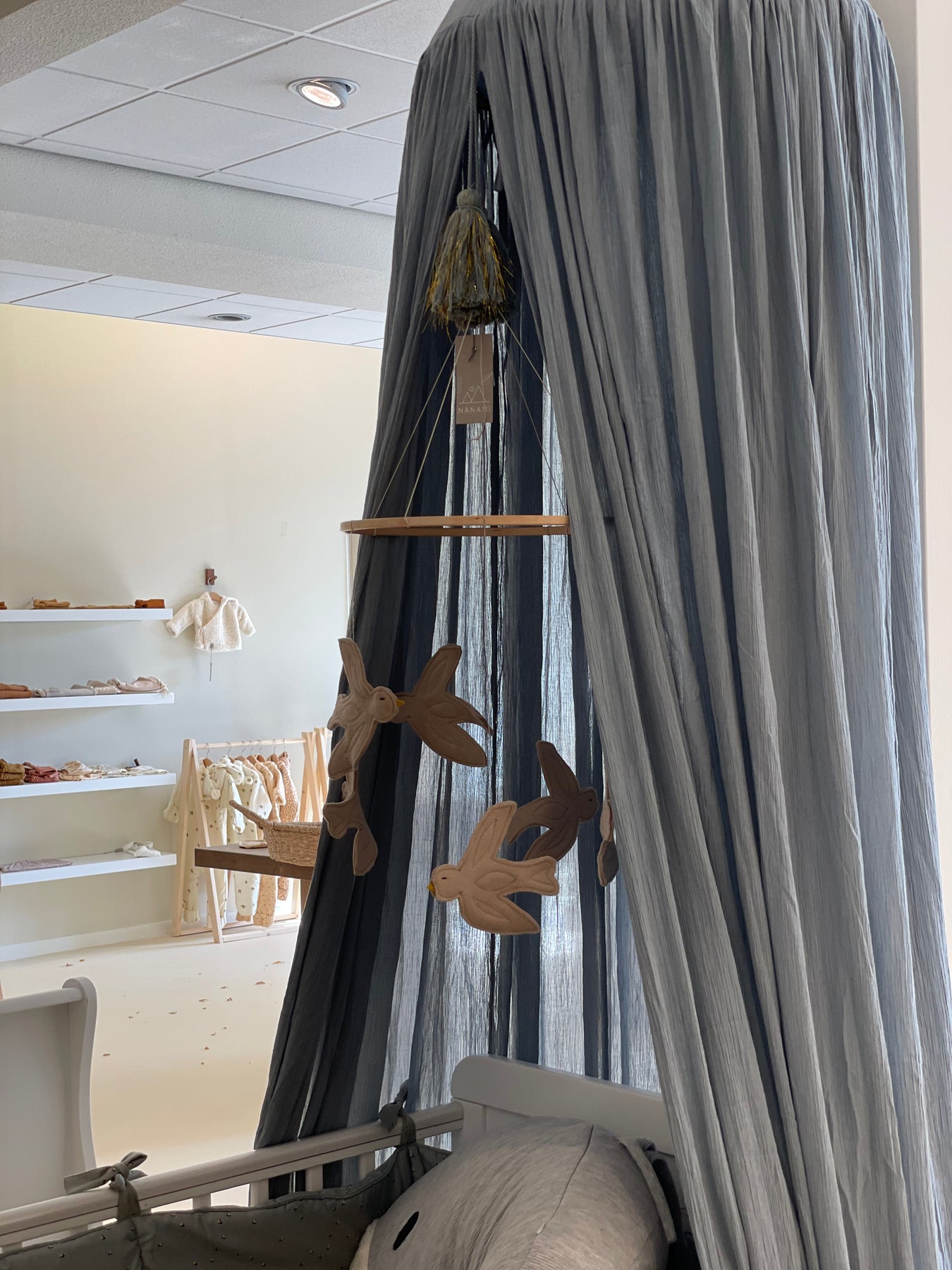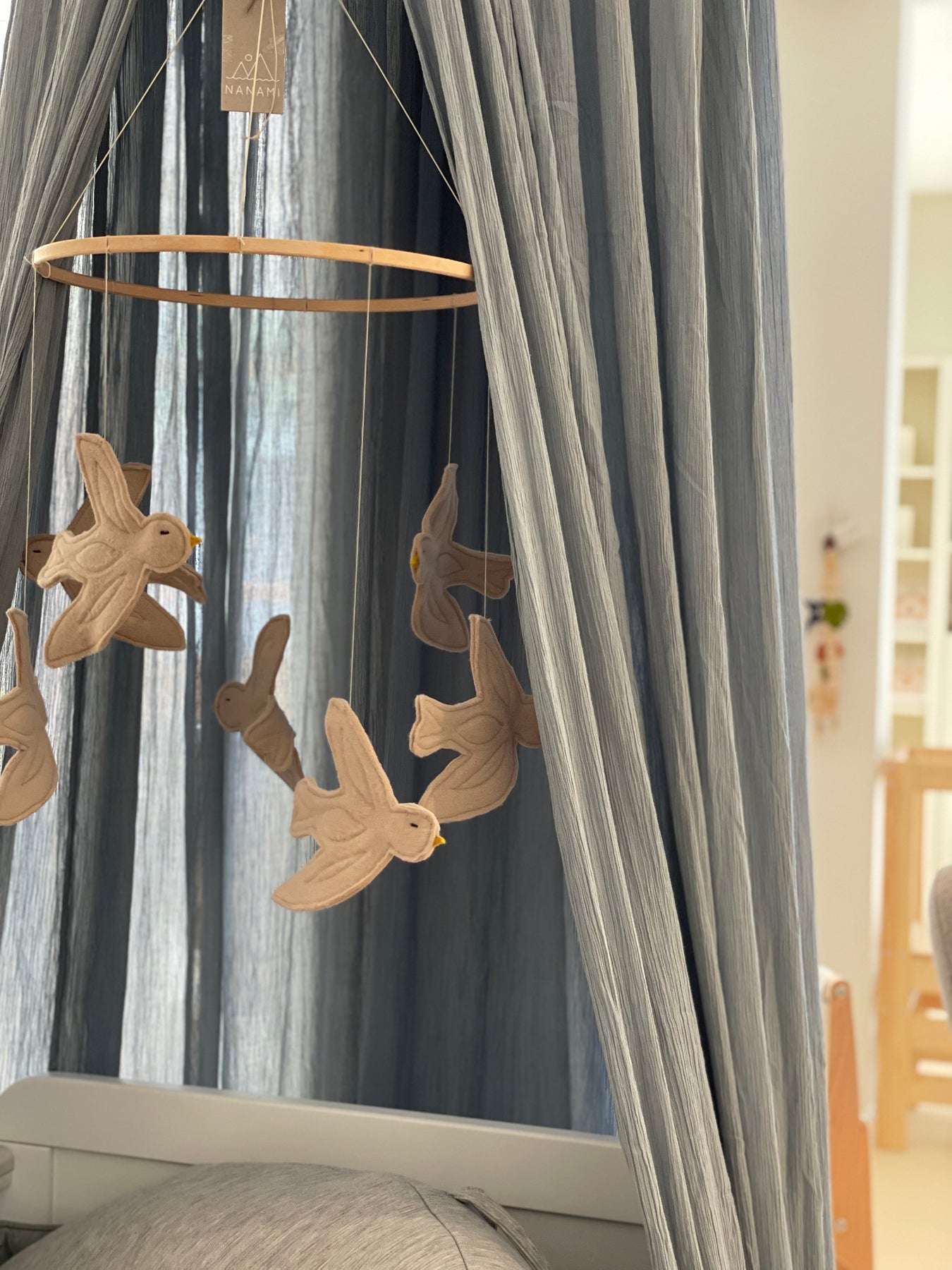 Breng serene, moderne elegantie in de kinderkamer met de Nanami Birds Mobile - een minimalistische mobiel van katoen en hout die je kleintje zachtjes betovert en moeiteloos in elk interieur opgaat.