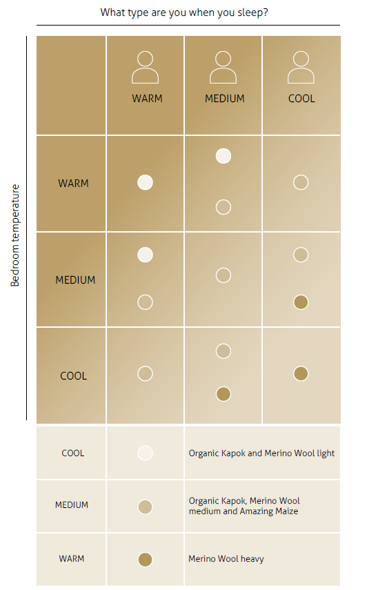 • Värme: medelvarmt för användning året runt; välj mellan sval, medelvarm eller varm värmeklass.