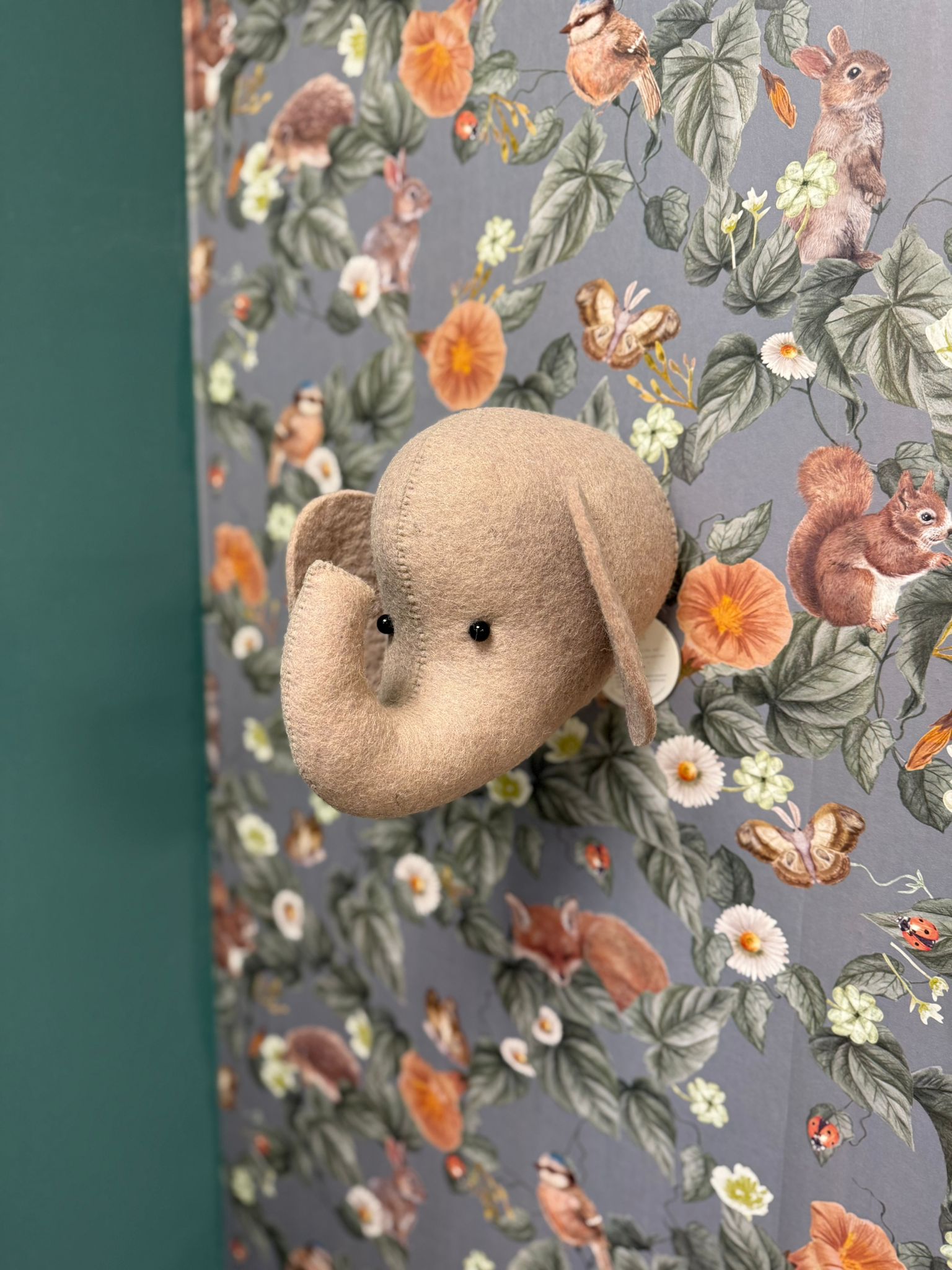 • Litet väggmonterat elefanthuvud i filt med en vänlig uppåtriktad snabel