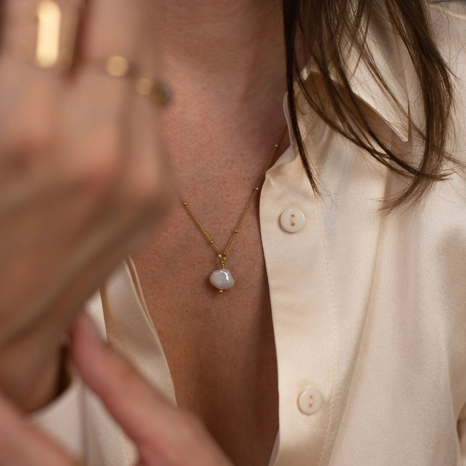 Bu altın kaplamalı kolye, özgün çift halkalı telden sarkan gerçek bir barok incisiyle klasik inci mücevheratına modern bir dokunuş katıyor. El yapımı her parça, size özgü bir his uyandırıyor.